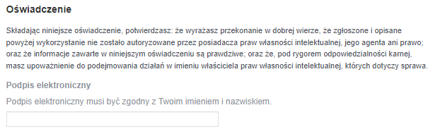 Ostatni etap to podpisanie oświadczenia. Zweryfikuj, czy Twoje dane, które widnieją w bazie Urzędu Patentowego są aktualne. Po latach mogła się zmienić np. forma Twojej spółki. Te nieścisłości platforma wychwyci, a wtedy nie uwzględni skargi.